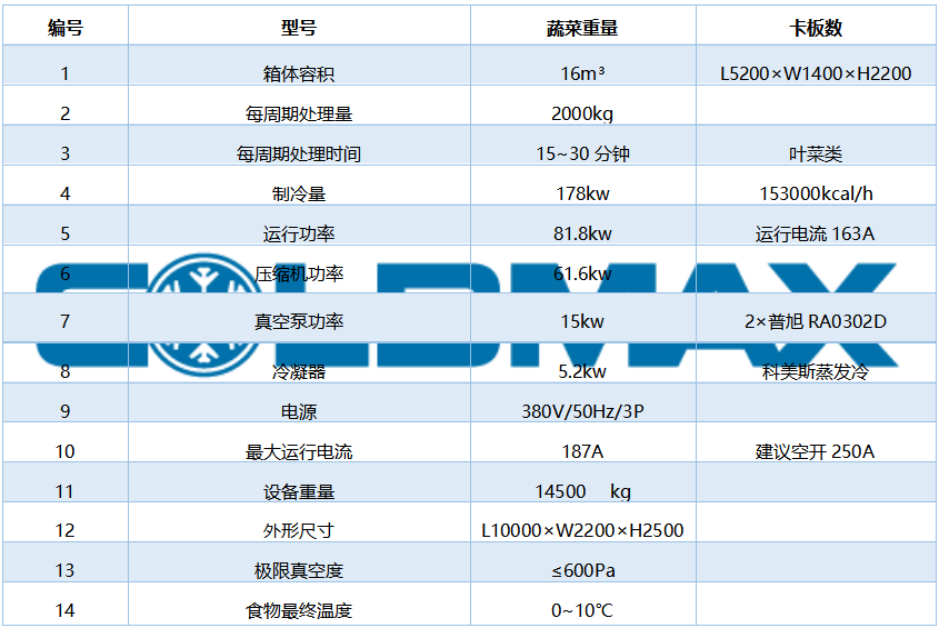 真空箱容积16m?,库容量2000kg,预冷温度设计为0~10℃;0