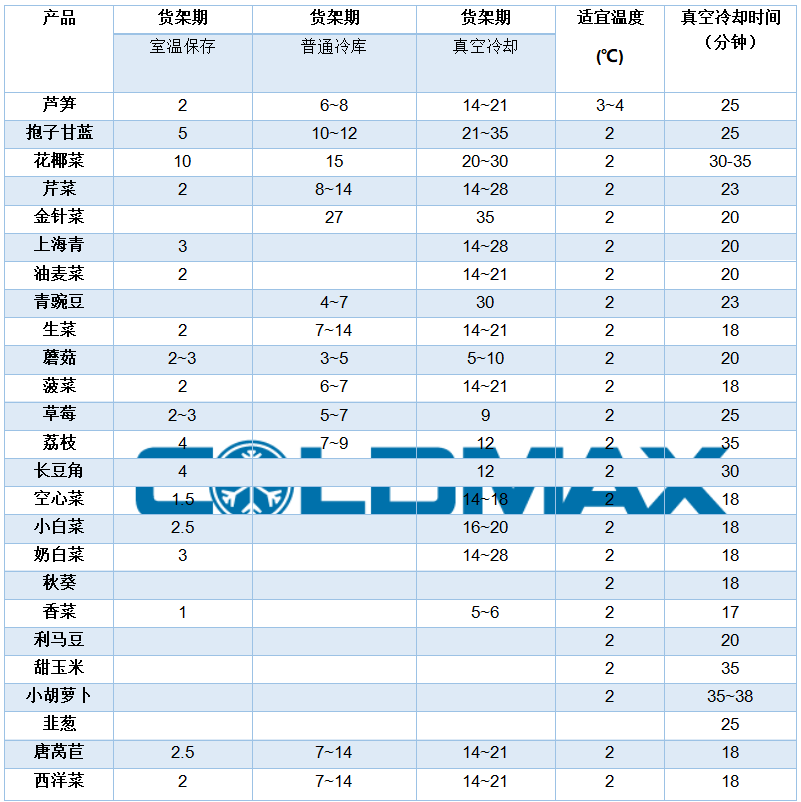 生鲜果蔬真空预冷、气调包装和普通冷藏保质期对比表(单位:天)