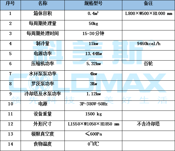 CVF-50 型号食品快速冷却机每周期处理食品量为50kg,处理时间10~20分钟;