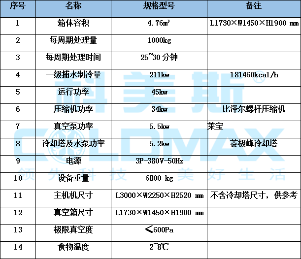 CVF-1000 型号食品快速冷却机每周期处理食品量为1000kg,处理时间10~20分钟;
