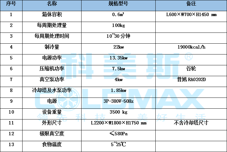 CVF-100 型号食品快速冷却机每周期处理食品量为100kg,处理时间10~20分钟;