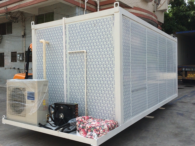 移动式冷库车厢顶板、前板、侧板、门板均采用目前市场流行的新型玻璃钢板材做厢壁内外蒙皮,冷藏车厢的中间层为新型无氟聚氨酯发泡材料,通过高强度胶粘剂、螺钉与骨架连接,隔热层厚度达75-150mm,隔热性能较好,车厢本体紧密坚实,强度高,表面平整美观、耐腐蚀、抗冲击、耐磨损、易清洗。