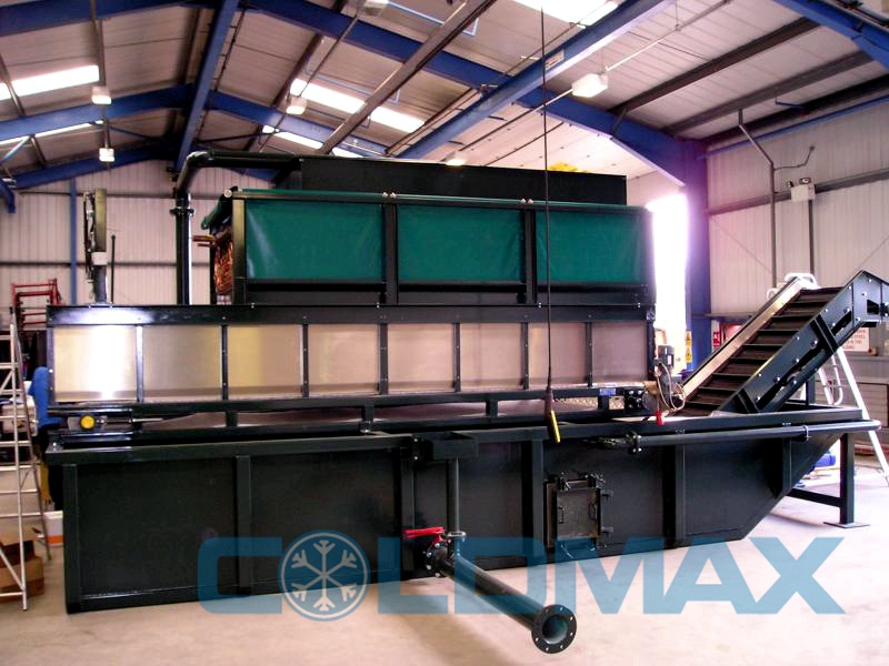 此水预冷设备,水流量36m?/H,水预冷机出水温度设计为7至10℃;制冷系统采用比泽尔半封闭式压缩冷凝机组,配置壳管蒸发器,通过循环水泵循环冷却冷水池中的水,使泡在冷水池中的果蔬能在从30℃下降至10℃左右以下(可按要求进行定制);控制系统采用LS 控制,处理设备运行中的各种反馈信息,确保设备正常运行。