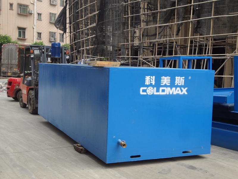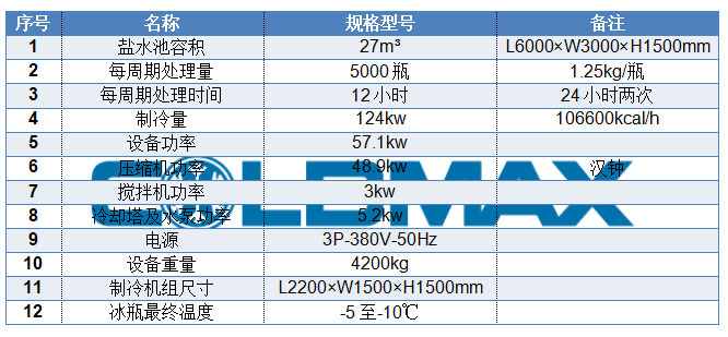 冰瓶机通常使用盐水间接式制冷。将装有水的塑料瓶放入盐水池中,盖上盐水池盖板,设备启动后,制冷机组开始运行;塑料瓶中的水先于盐水池中的盐水凝结成冰,从而实现冰瓶的制作。