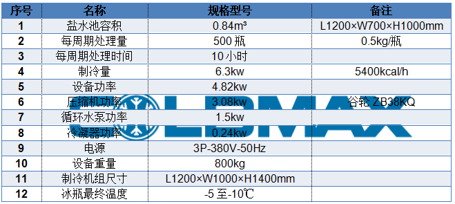 冰瓶机通常使用盐水间接式制冷。将装有水的塑料瓶放入盐水池中,盖上盐水池盖板,设备启动后,制冷机组开始运行;塑料瓶中的水先于盐水池中的盐水凝结成冰,从而实现冰瓶的制作。