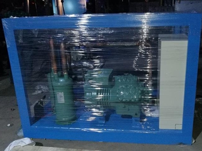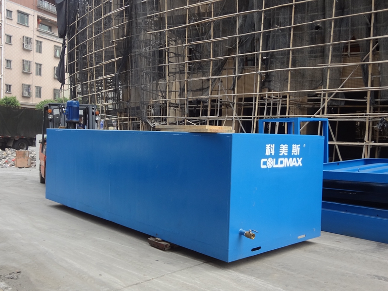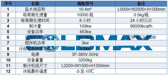 冰瓶机通常使用盐水间接式制冷。将装有水的塑料瓶放入盐水池中,盖上盐水池盖板,设备启动后,制冷机组开始运行;塑料瓶中的水先于盐水池中的盐水凝结成冰,从而实现冰瓶的制作。