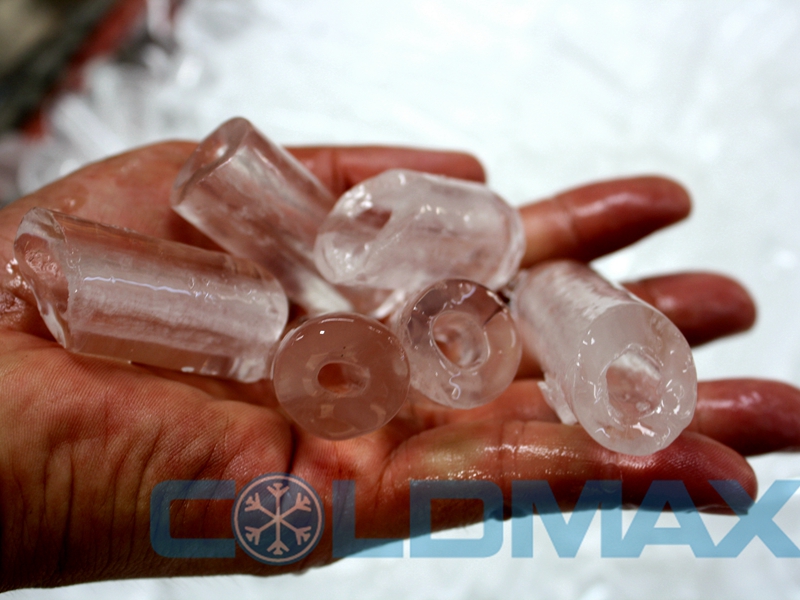 管冰呈中空圆柱形状,外直径尺寸为φ26mm、φ28mm、φ30mm、φ34mm等多种规格,长度27~50mm不等。内孔直径可根据制冰时间调整,一般控制在φ5~10mm之间。