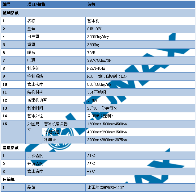 管冰机配备数字压控、机械压控和时间继电器三重保护,严格控制冰块成型速度,防止不锈钢管冻裂,冰块成型后在上述三种控制作用下制冰系统向蒸发器供热,使得冰块自由下落,与此同时与冰刀相切,形成长度 3-125px 不等的圆柱形冰块,即管冰。
