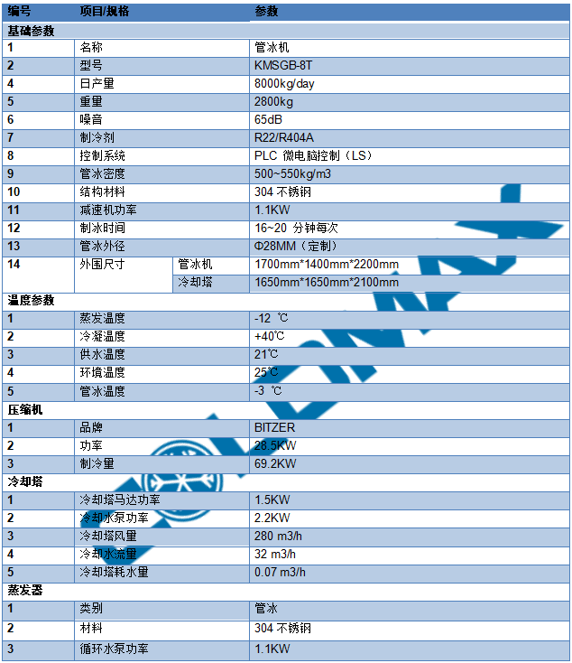 管冰机是一款生产圆柱型食用冰块的制冰机。由多根不锈钢管组成蒸发器,制冷剂在管与管之间流动,水在管内从上往下在分水器的作用下呈螺旋状流动,水在流动过程中凝结成冰。