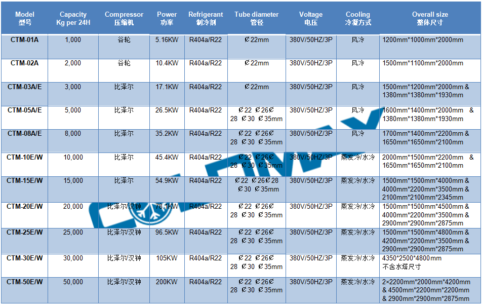 制冷系统: A.氟系统(R404a、R22);B.氨系统(R717)