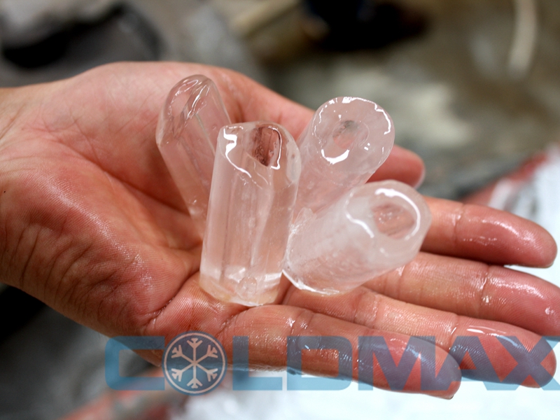 ●管冰呈中空圆柱形状,外直径尺寸为φ26mm、φ28mm、φ30mm、φ34mm等多种规格,长度27~50mm不等。内孔直径可根据制冰时间调整,一般控制在φ5~10mm之间。