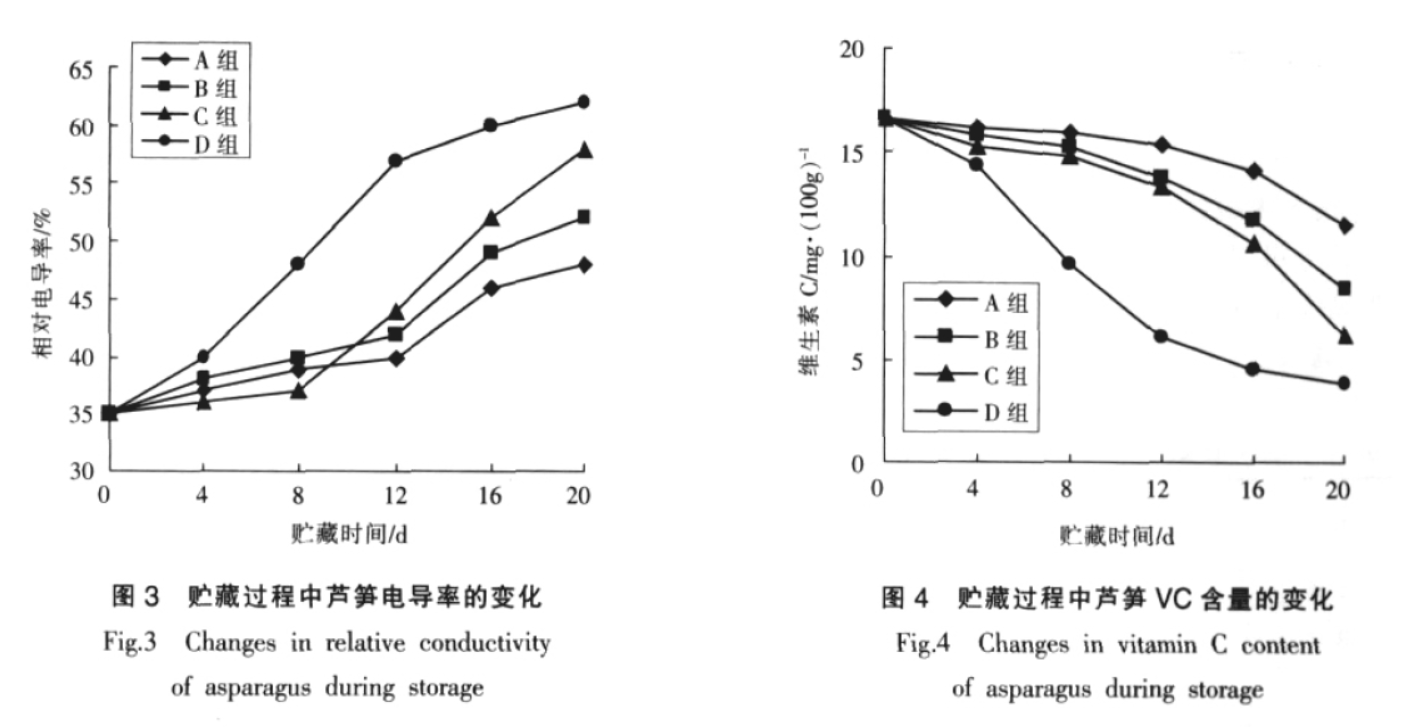 细胞膜透性的大小可用组织的相对电导率来衡量,相对电导率越高,说明细胞膜透性越大。从图3可以看出,对照组D未经预冷及MAP包装处理,贮藏过程细胞膜透性增加很快,贮藏20d时相对电导率为62%;而芦笋经预冷处理后,贮藏前8d细胞膜透性变化不大,但贮藏8d后细胞膜透性迅速增加。真空处理的芦笋贮藏20d时其相对电导率最小,仅为对照组的77.4%。