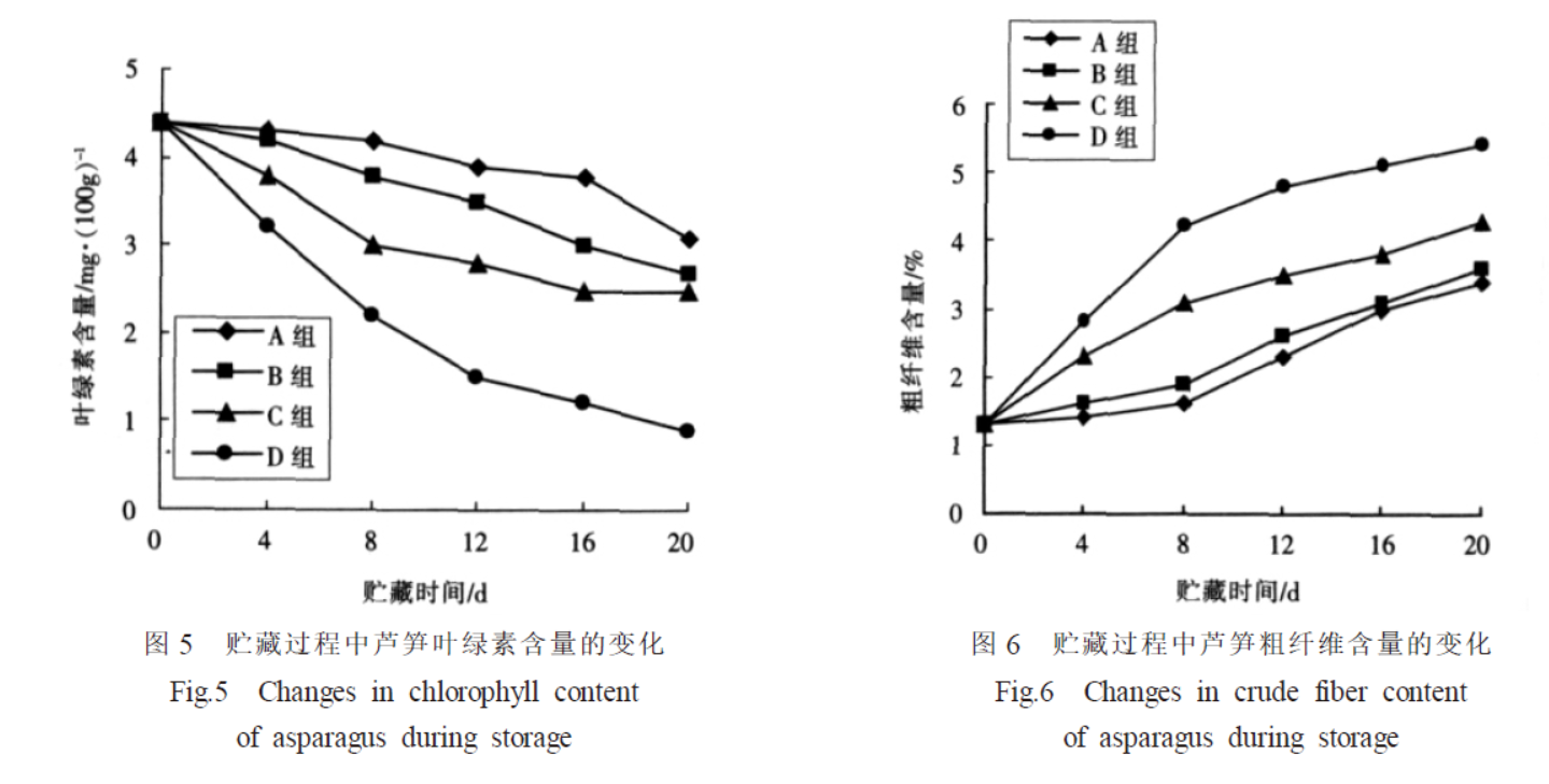 芦笋的表皮色泽(绿色)是重要的品质感官指标。由图5可以看出,芦笋采后的叶绿素含量随贮藏时间的延长而逐渐减少。A、B、C试验组经预冷和MAP包装处理,明显延缓了叶绿素的分解,贮藏20d时,能较好地保持芦笋表皮的绿色。其中经真空预冷的芦笋表皮叶绿素含量最高,达3.1mg/100g。对照组D芦笋仅贮藏8d,其叶绿素含量降低50%,表皮颜色褪绿变黄,影响了芦笋的商品价值.