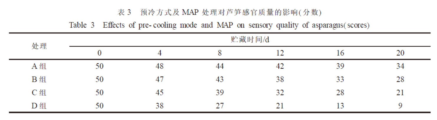 对果蔬原料的色、香、味等感官指标进行评价,是衡量果蔬保鲜效果的重要手段。从表3感官质量评分可以看出,A、B、C3个试验组的感官指标明显优于对照组D。对照组未经预冷及MAP包装,贮藏至第8天时,笋头萎蔫且呈水渍状,失水严重,色泽变黄而失去商品价值。芦笋采用不同的方式预冷,其贮藏效果也存在差异。真空预冷的芦笋感官评分最高34分,品质最好,贮藏20d时仍具有较好的商品价值;其次为冰水预冷的芦笋;最后为冷库自然预冷的芦笋。