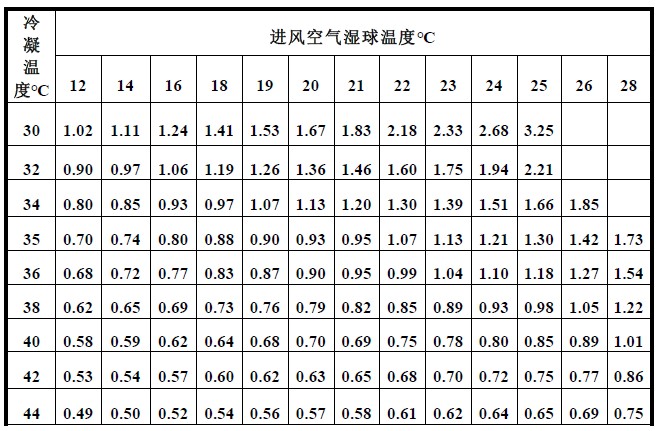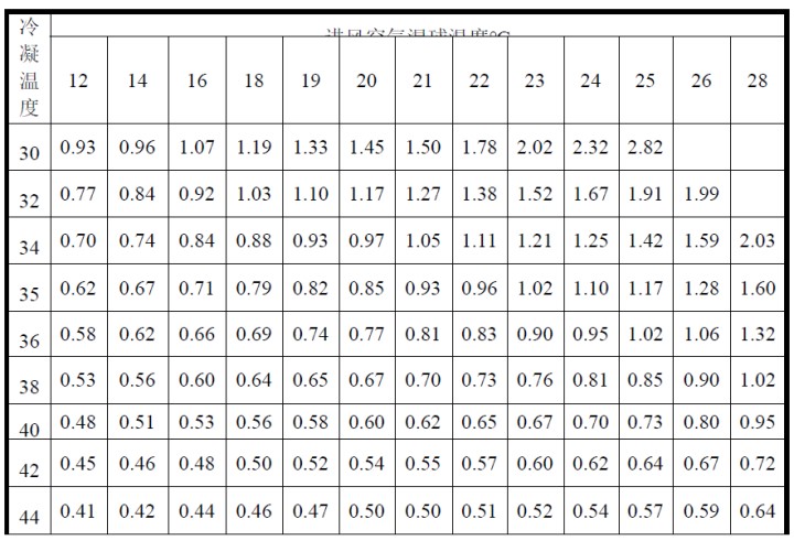 由排热系统数表中查得冷凝器温度35℃,湿球温度27℃时的排热系数为1.28。