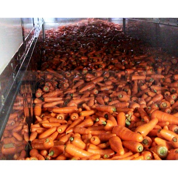 冷水预冷是以水为介质的一种冷却方式,将果蔬浸在冷水中或者用冷水冲淋,达到降温的目的。冷水(一般在3℃左右)和自来水两种,前者冷却效果好,后者生产费用低。目前使用的水冷却方式由水池和传送带系统完成。水冷却降温速度快,产品失水少,但要防止冷却水对果蔬的污染。因此,应该在冷却水中加入一些防腐药剂,以减少病源微生物的交叉感染。商业上 适合于用水冷却的果蔬有柑橘、胡萝卜、芹菜、甜玉米、网纹甜瓜、菜豆等。