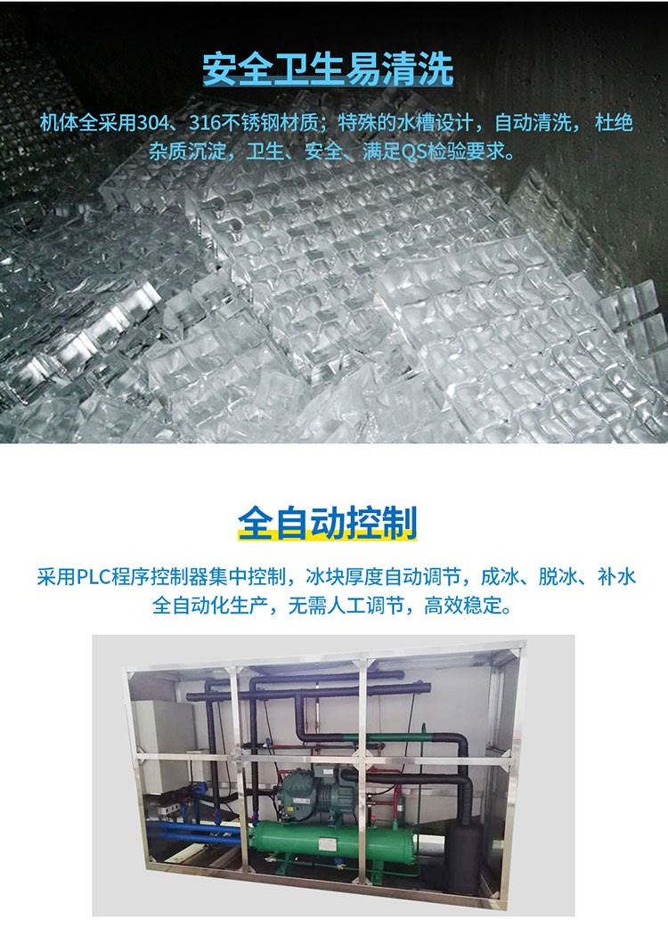 采用PLC程序控制器集中控制,冰块厚度自动调节,成冰、脱冰、补水全自动化生产,无需人工调节,高效稳定。