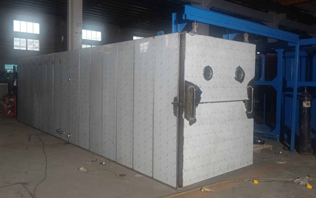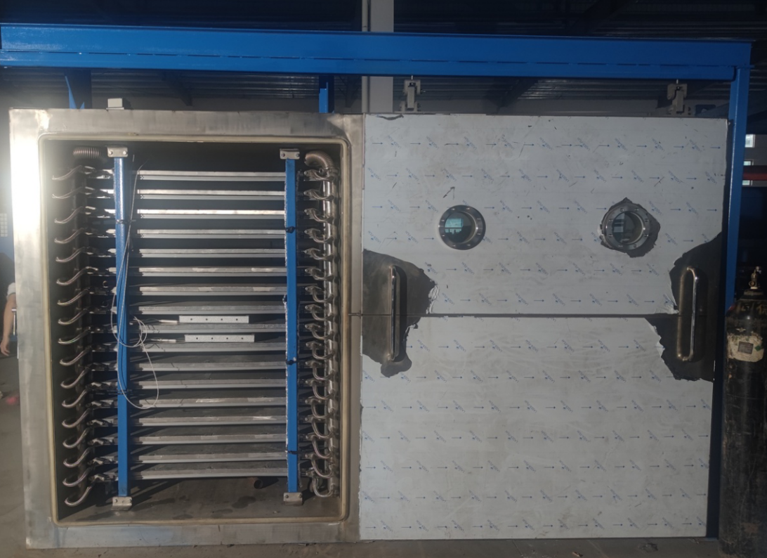 本项目用于速冻然后冷冻干燥加工设备,真空箱搁板面积5㎡,干燥仓尺寸:¢1800X5000mm(铝搁板面积5m2),库容量50kg;冷冻干燥就是把含有大量水分的物质,,在真空箱内先冻结成固体,然后在真空条件下使水蒸气直接升华出来,而物质本身剩留在冻结时的搁架中,因此它干燥后疏松多孔体积不变,为了加快升华速度,搁架会同时进行加适当加热,整个干燥过程都是在较低温度下进行的,加热设计在30℃,制冷原理是依据水随压力降低其沸点也降低的物理性质,将预食品置于真空箱中抽真空,当压力达到一定数值时,食品表面的水分开始蒸发,并带走食品内部的热量,从而使食品整体达到快速降温的效果。