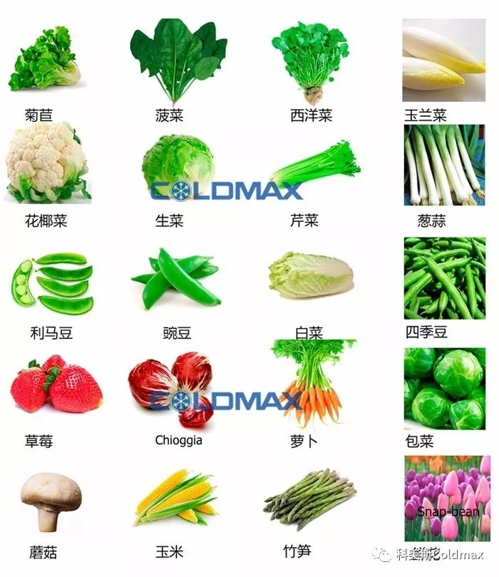 芦笋、抱子甘蓝、卷心菜、胡萝卜、花椰菜、芹菜、大白菜、黄花菜、莴苣、青豌豆、生菜、甜玉米、秋葵、韭菜、蘑菇、菠菜、鲜花、草莓、樱桃、浆果。