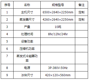 F.脱冰迅速快:水冻结成冰后,制冰系统反向加热,热氟进入蒸发器脱冰,脱冰速度快;脱冰后直接落在冰输送装置上,无需行车等取吊设备。