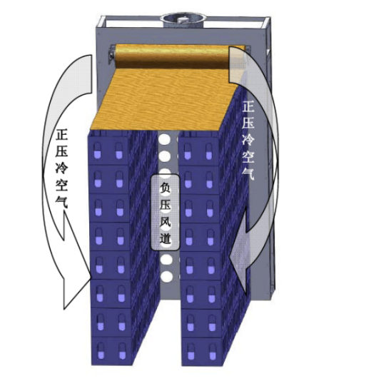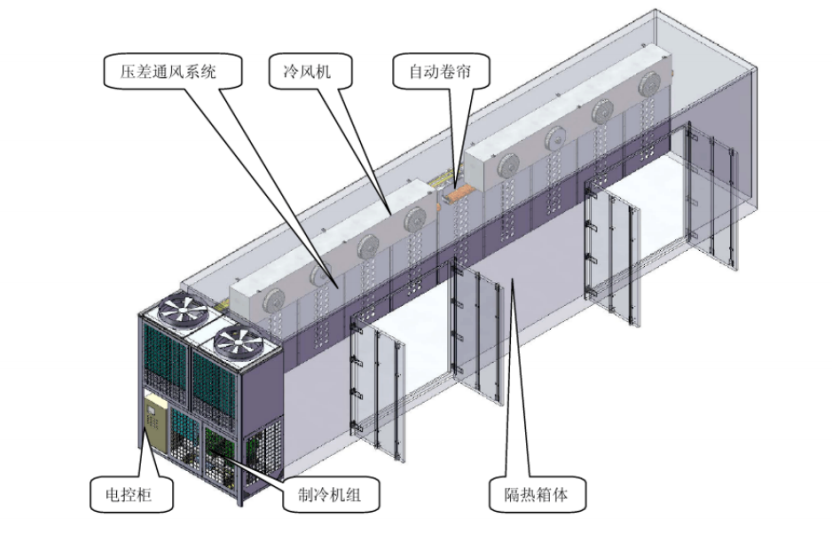 隔热箱体,根据果蔬压差预冷的需要,通过特殊设计,箱体前端设有安装制冷压缩机组、冷凝器和电控箱的框架,其支柱与箱体支柱为一体;箱体后端为双开合页门,便于果蔬进出。箱体采用轻质且高强度的镀锌钢作主框架,用铝合金杆件或钢板压型杆件构成上、下侧梁箱门结构;箱内壁、底板、顶板和门均由不锈钢板制造:箱体六个面均采用聚氨酯板作隔热材料。
