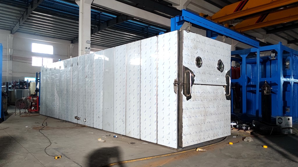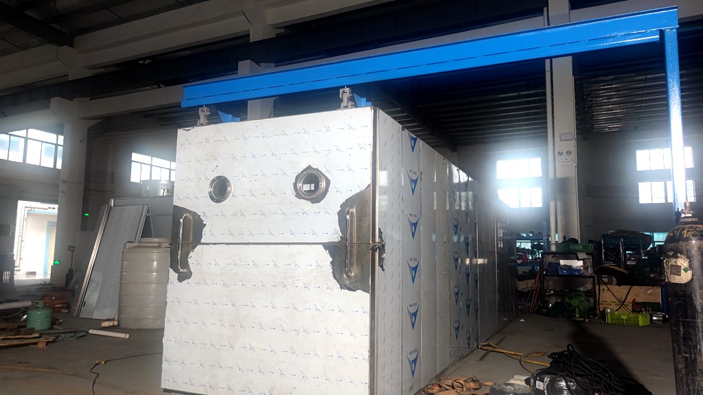 集抽真空与加热干燥功能为一体的的密闭容器,物料的升华干燥过程在干燥仓内完成的,物料是放在干燥室内搁板上的不锈钢托盘内的,按每平方托盘面积8~12公斤的比例装料,每一层搁板上都有一个可供测量物料温度的探头,用以监测整个冻干过程中的物料温度。